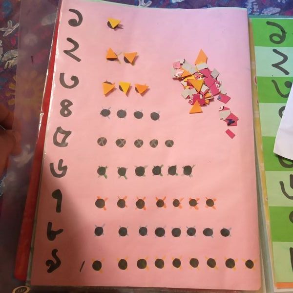 বাংলা ইংলিশ আরবীতে দশ পর্যন্ত গুনতে শিখাই, সংখ্যা দেখে চেনা, ট্রেস করতে পারা। একই রঙের আটটা করে ছয় রঙের আটচল্লিশটা পপস্টিক দিয়ে বলি, হলুদ স্টিকগুলো আমাকে দাও। ও হলুদগুলো উঠায়(fine motor skill+color recognition), এরপর বলি গুনতে। ও একটা একটা মাটিতে রেখে গোনে(counting).